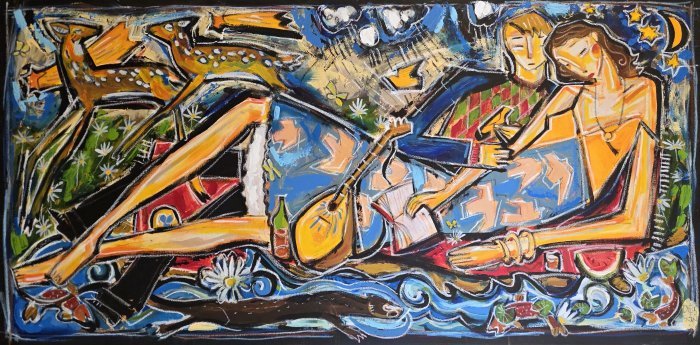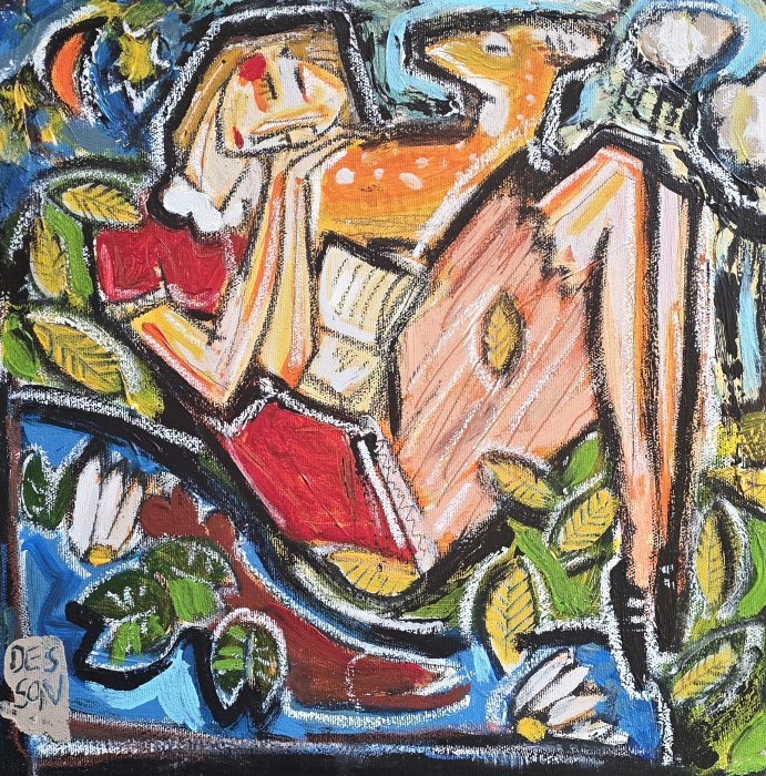 For Desson the act of painting is like drawing. He takes it further line by line, brush stroke by brush stroke. Many of Desson’s colourful paintings reflect a humanist spirit. With their bold dark outlining, and love of life.
