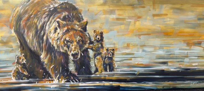 “Riotous Strokes” is a two word summary of my landscapes and bears. I do not simplify subjects, but rather layer color and irregular, seeming random brushstrokes on the canvas in an impressionistic style with abstract elements. From up close, the canvas is a maze of unstructured strokes of color, irregular, interwoven, multilayered and anything but simple.