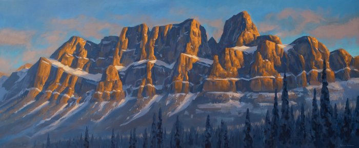 Many of Darren's works tend to highlight the rugged, dynamic, and awe-inspiring nature of the mountains; he strives to depict the mountains with a lively balance of their realistic rawness and their magical, idyllic allure. Darren is equally likely to paint a grand, sweeping vista of summits in the morning sun, or a lowly pile of boulders in a streambed; the possibilities are endless for a landscape painter in the vastness of the Canadian Rockies.