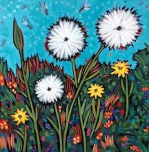 Gradually, Pam changed her medium from printer’s ink to mixed media and collage; finally, to acrylic paint. In acrylic paint Pam found a long-running medium in which to create her signature bold and colourful images.